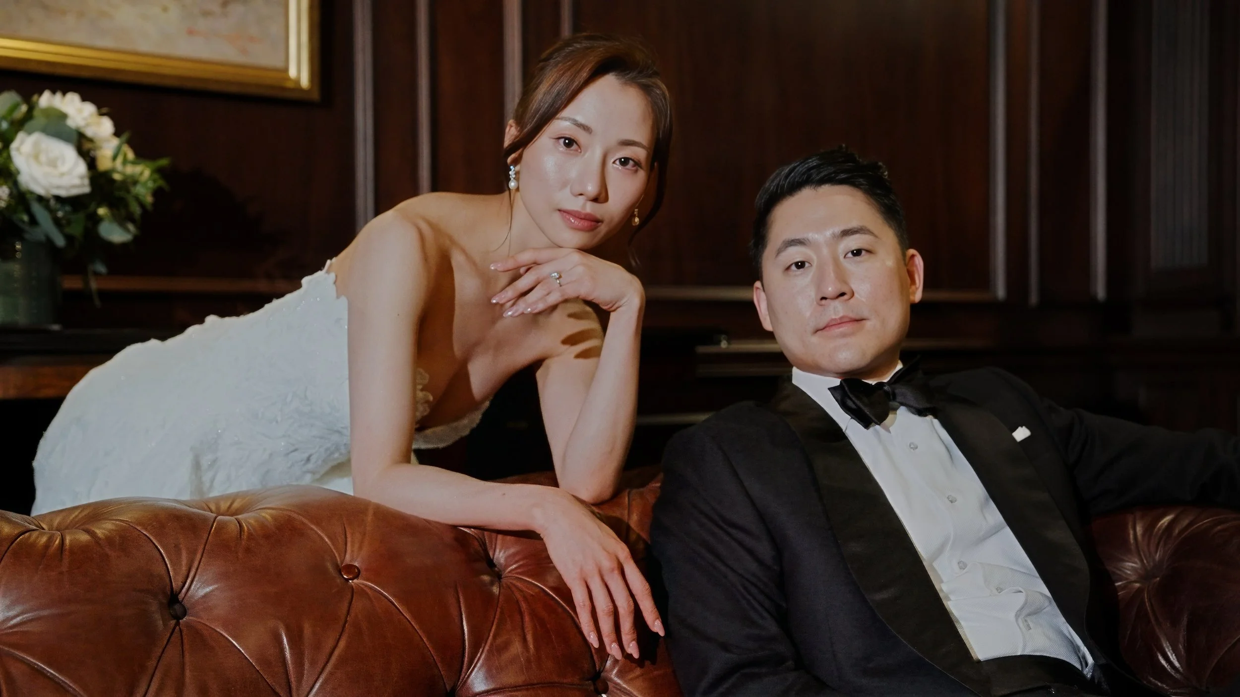 The combination of festive decor and sophisticated attire creates a dramatic and stylish look for your winter wedding photos.